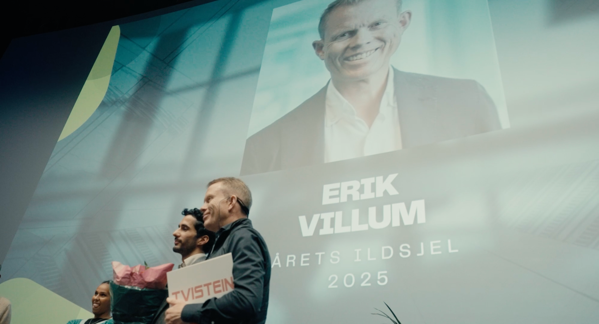Erik Villum mottar prisen Årets ildsjel 2025 under Valgene som former deg-arrangementet på Odeon kino i Oslo. Tidligere mottaker av Årets ildsjel, Hirad Modabberi, er også til stede.